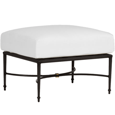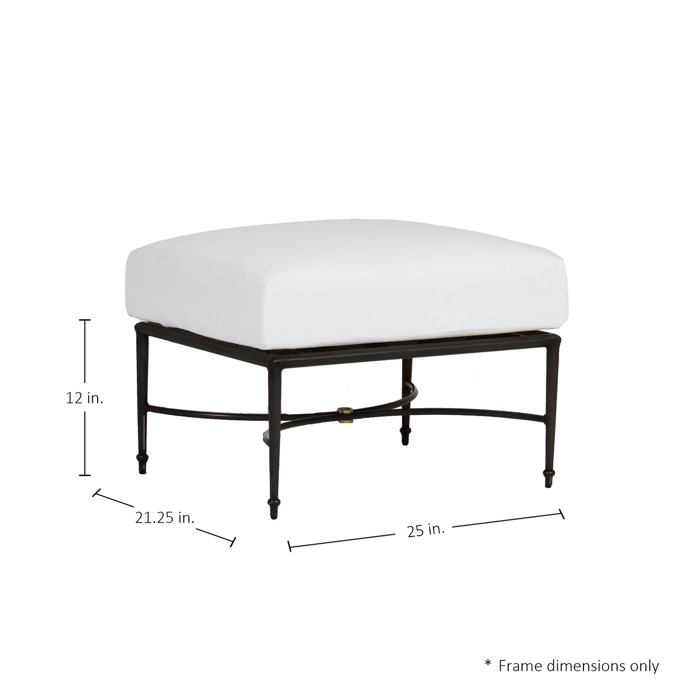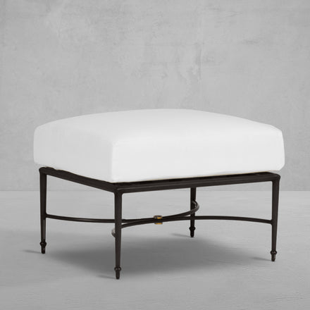 Introducing the Roma Ottoman, imbued with the elegance of adored Italian style. Crafted from wrought aluminum in Slate Grey, it features a contoured stretcher adorned with a brass accent and is complemented by plush cushion. Use the ottoman alone as extra seating, or pair it with the Roma Lounge or Sofa for relaxed outdoor lounging.