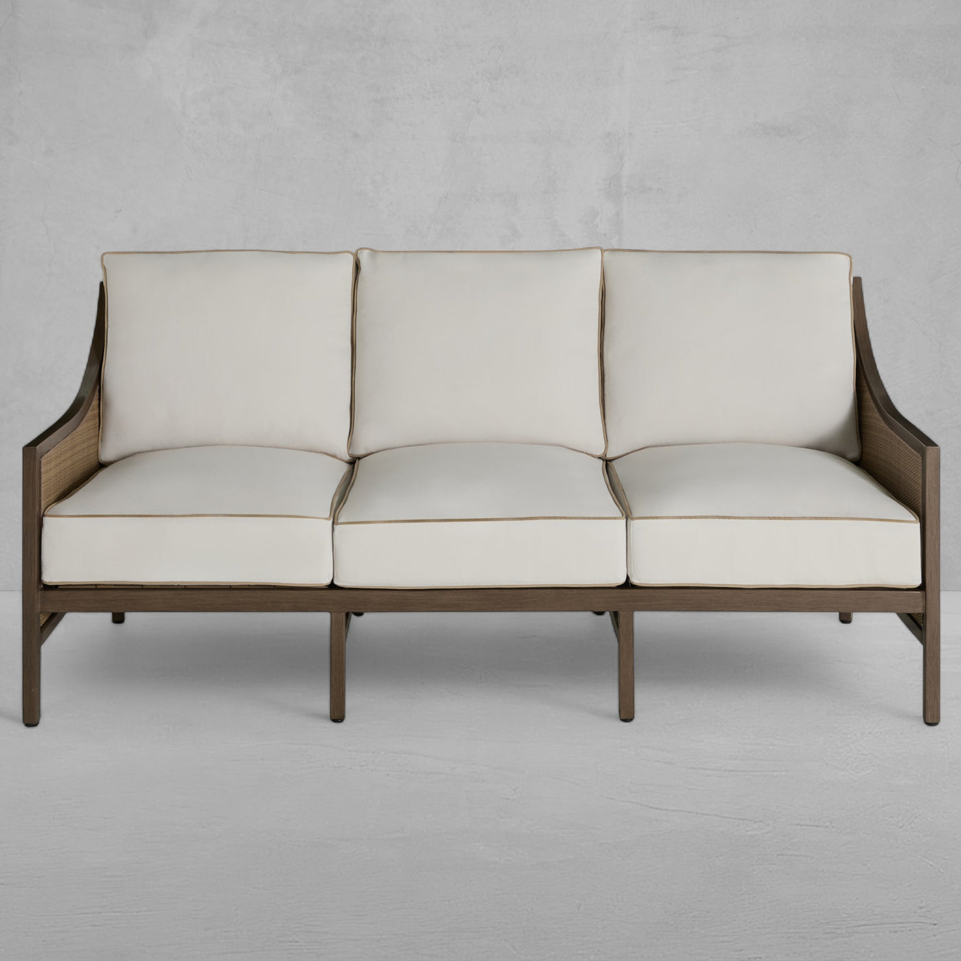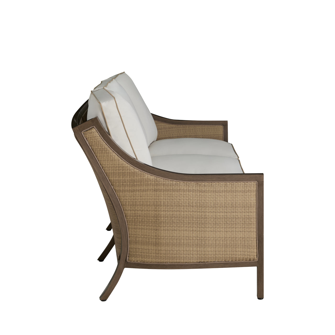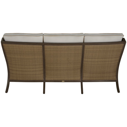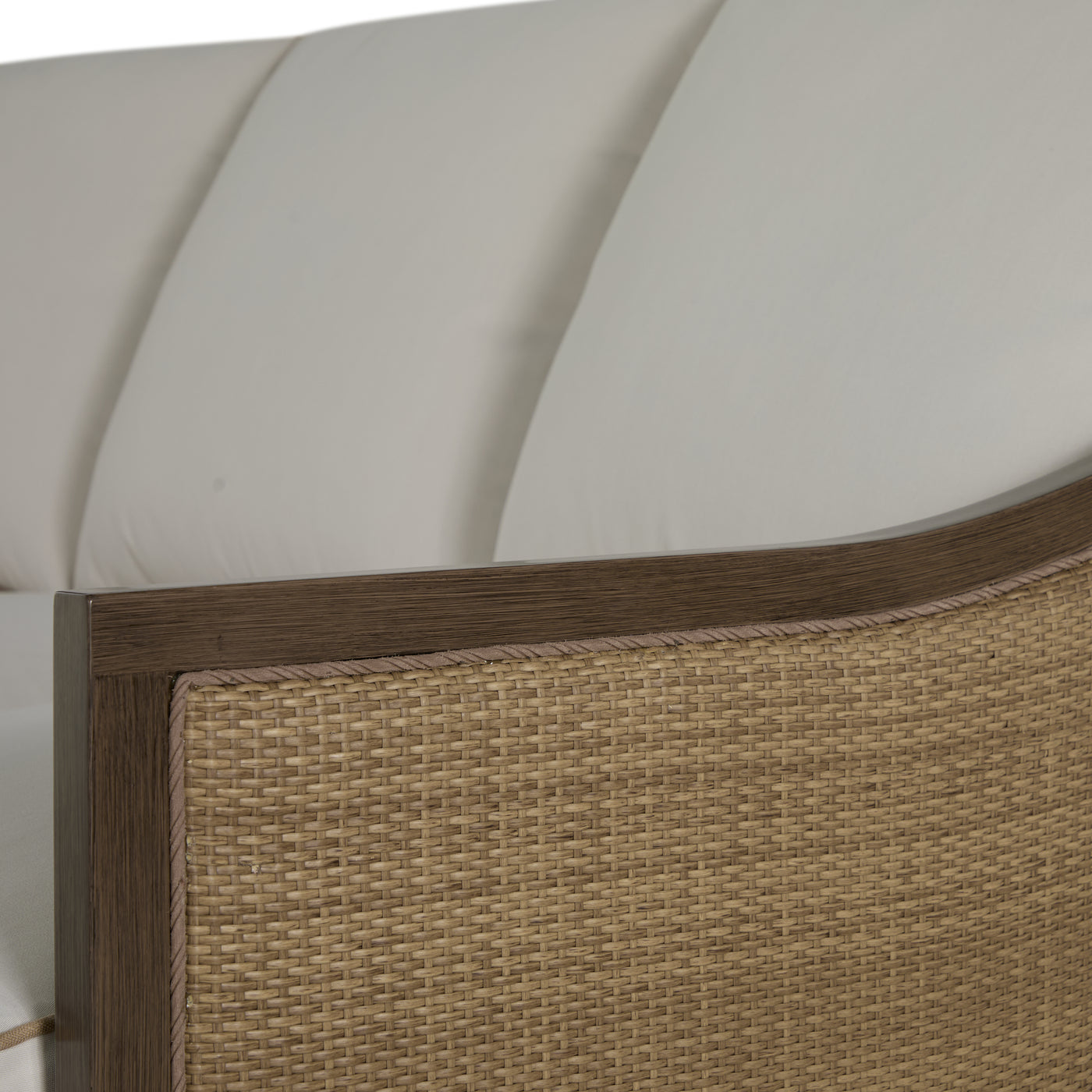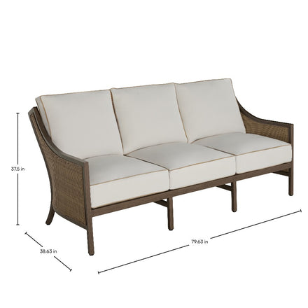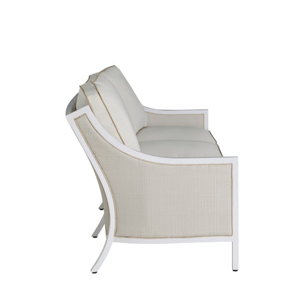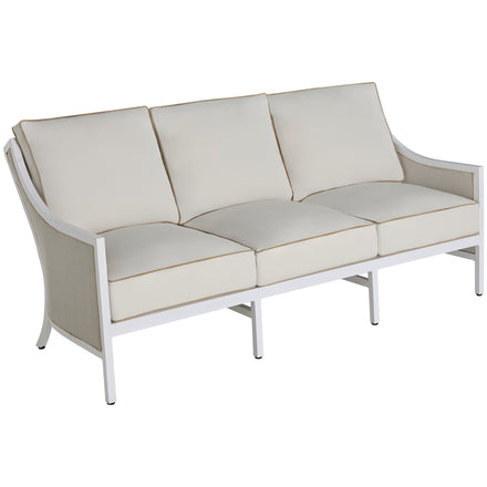 The Grand Bermuda Sofa combines a wingback design with a raffia-like N-Duraâ„¢resin wicker on an aluminum frame for durable, year-round comfort. Its gentle slope and high-back construction combined with our plush cushions offer superior relaxation. Finished to mimic natural wicker, this UV-resistant material preserves its color and integrity for years, outperforming standard wicker. This sofa is perfect for leisurely lounging, social gatherings, or as a stylish focal point in any outdoor setting, seamlessly blending functionality, durability and timeless appeal. Available in various fabric choices, it delivers enduring style and comfort in either our Standard Plus or Dream Cushions.