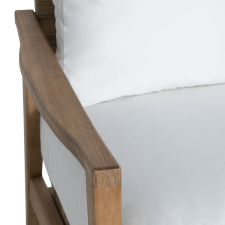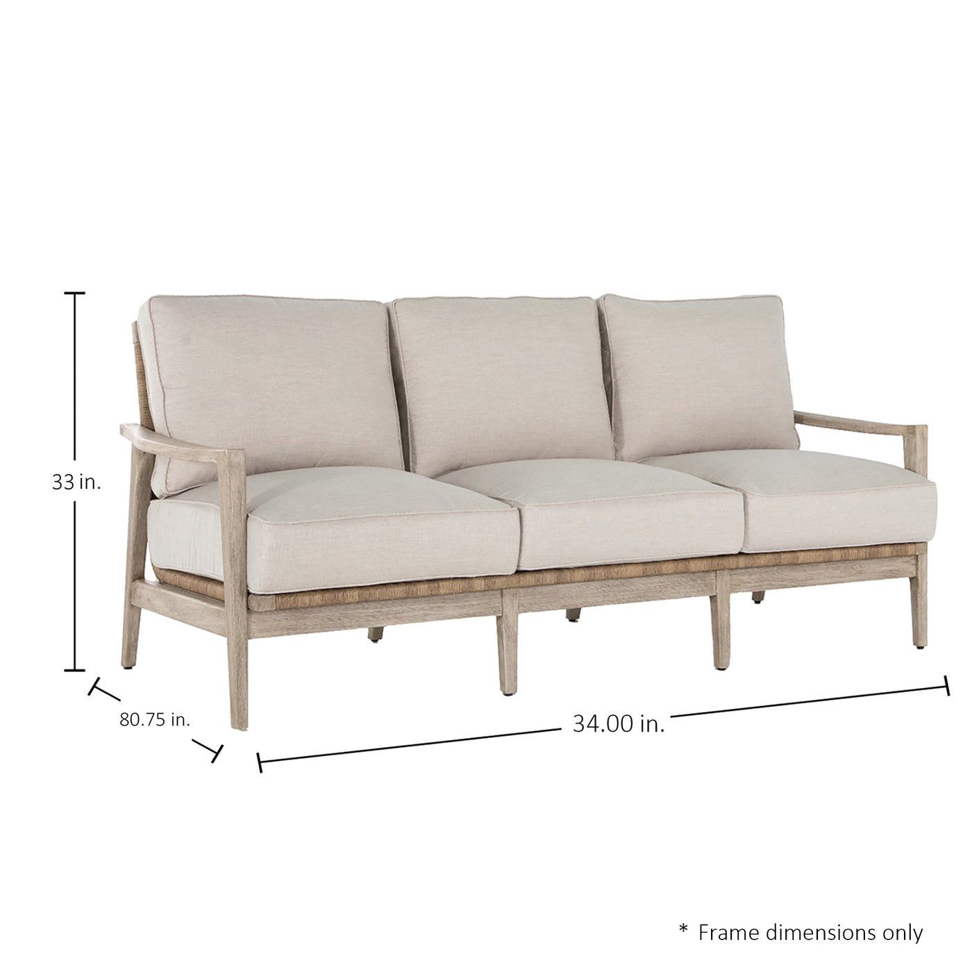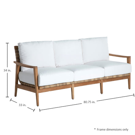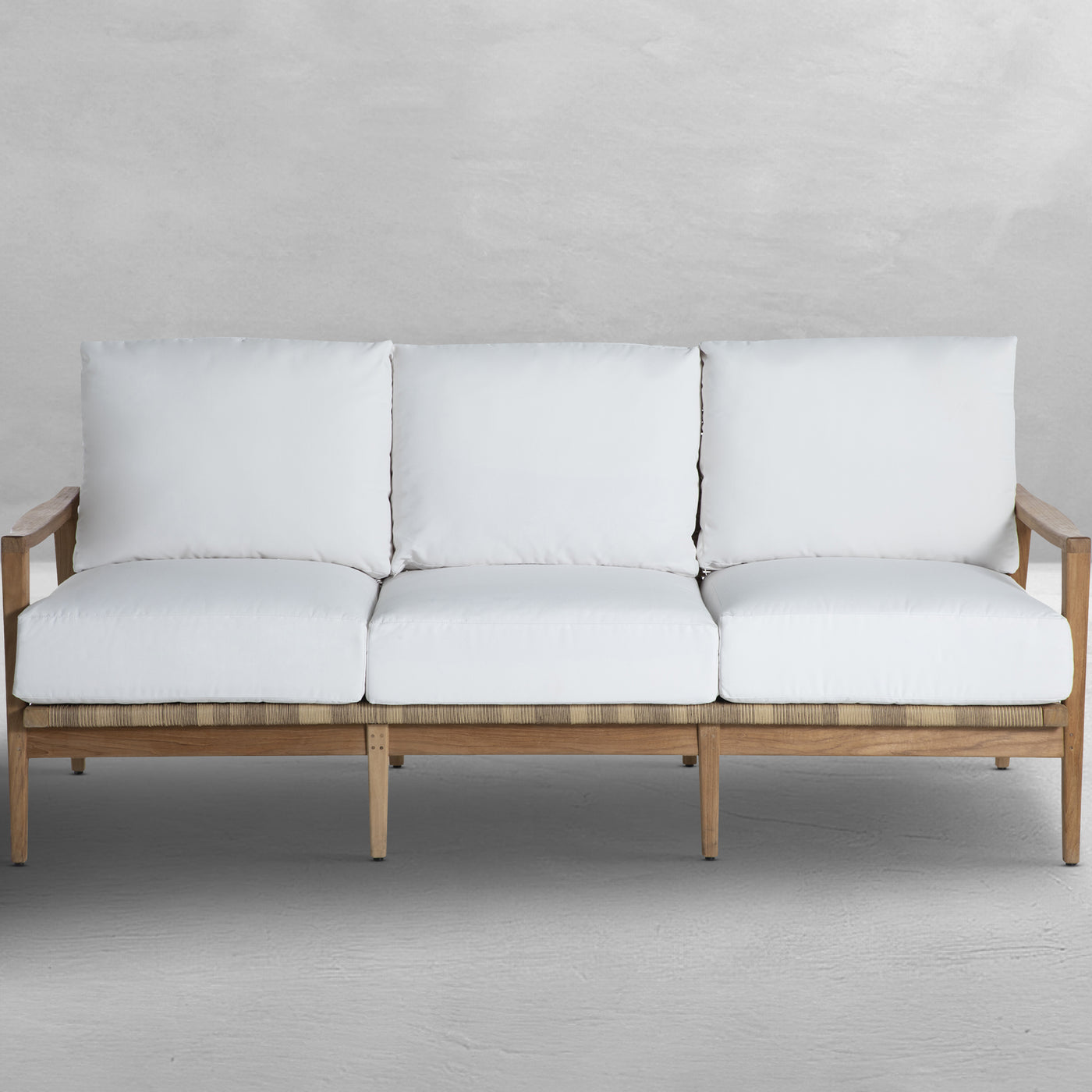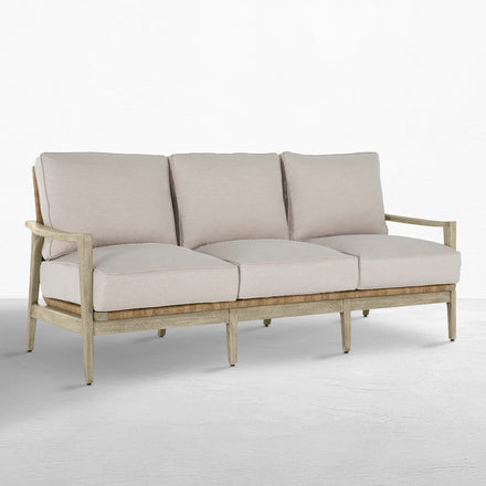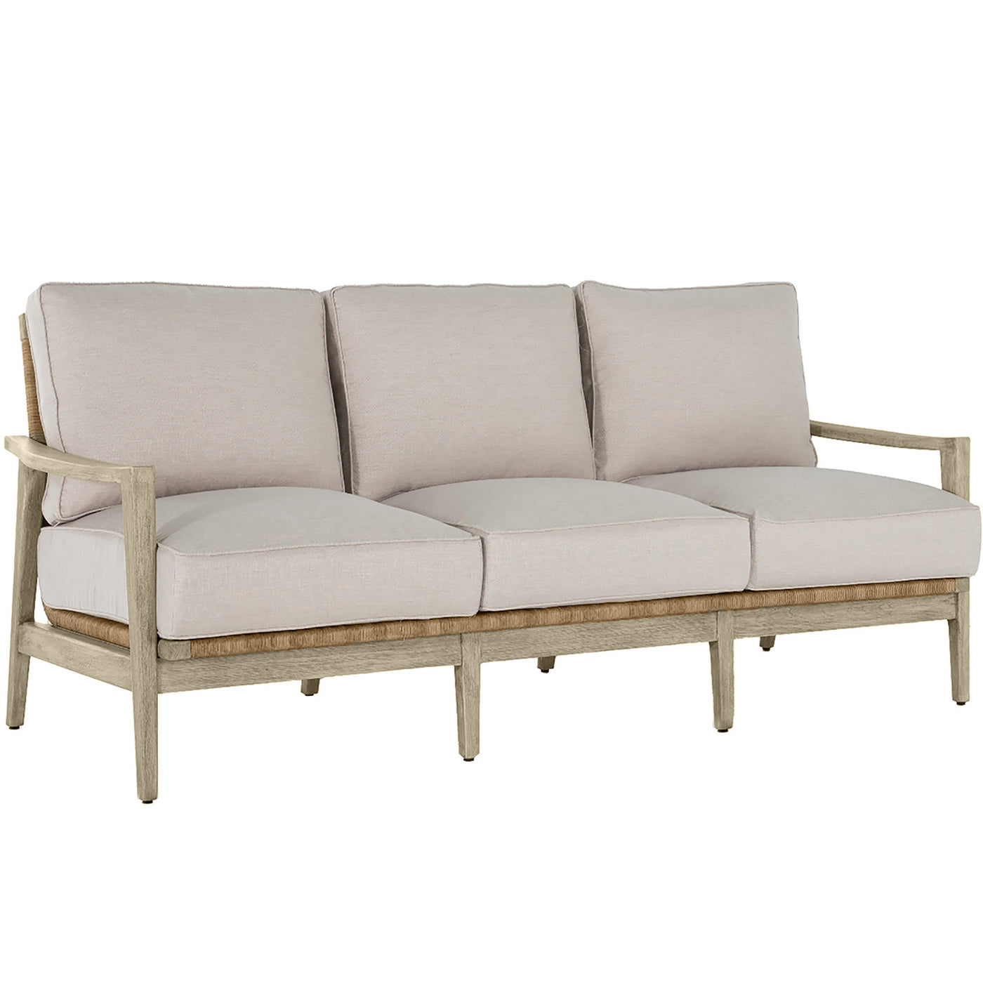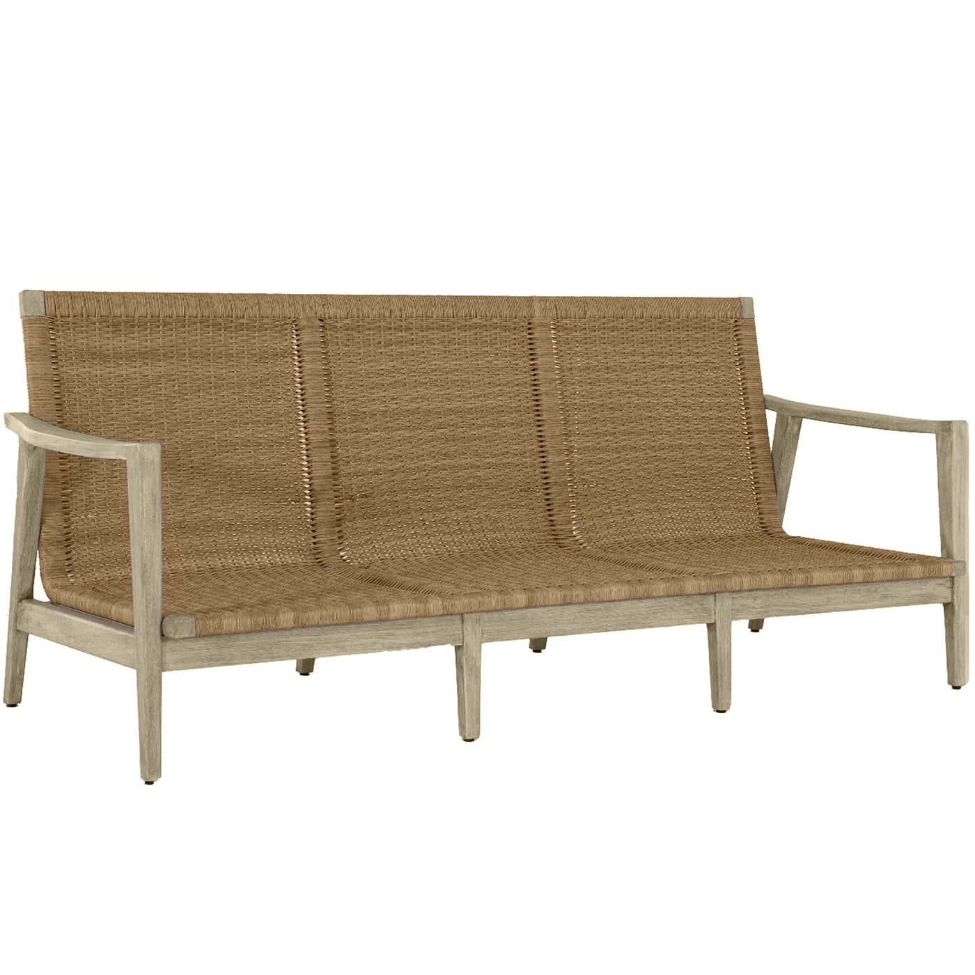 Introducing the Pointe Sofa, an exquisite addition to the Pointe Collection that seamlessly blends mid-century sophistication with modern practicality. Now available in a refined oyster teak finish and natural N-Duraâ„¢ resin wicker, this sofa is crafted from premium Indonesian teak, celebrated for its strength and dense grain, ensuring long-lasting beauty and performance in outdoor settings. The N-Duraâ„¢ resin wicker offers a comfortable and inviting seating experience, ideal for lounging with or without additional cushions. With its distinguished silver patina, the Pointe Sofa maintains its timeless elegance and easy-care nature.