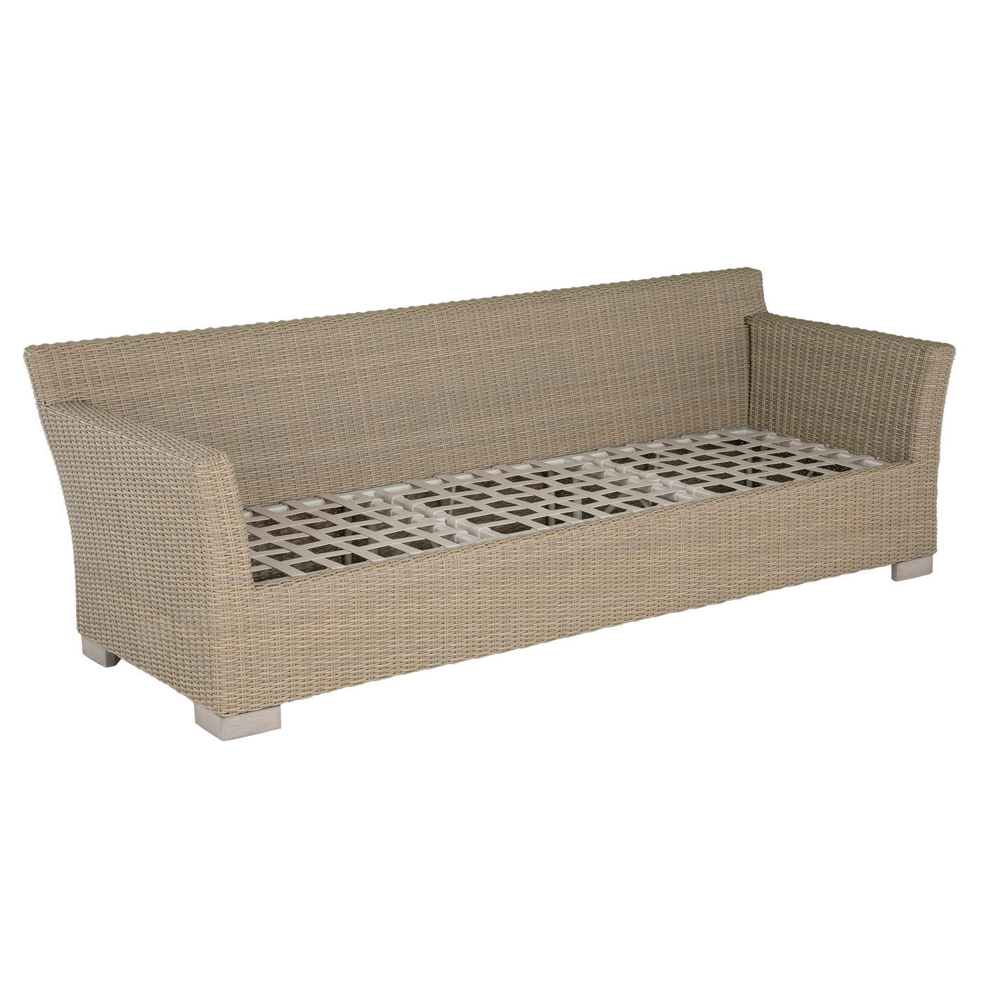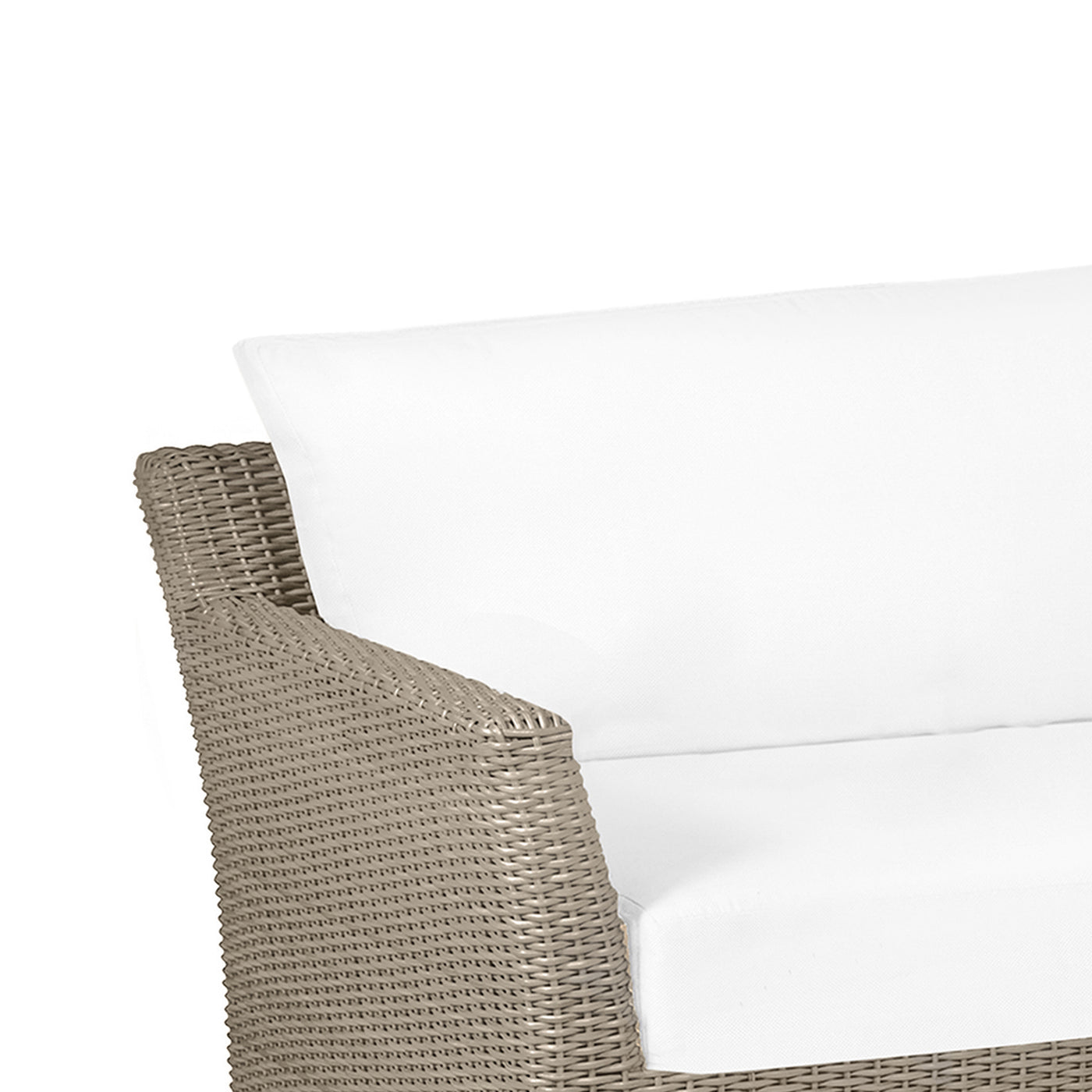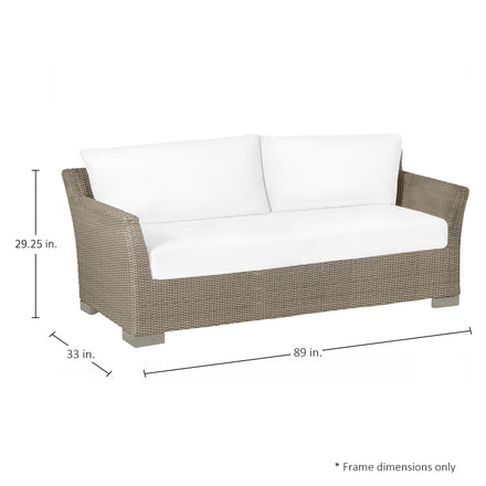 The Club Woven Sofa combines robust construction with an elegant and traditional handwoven wicker design. Featuring a sturdy wrought aluminum frame under the intricately handwoven and durable N-Duraâ„¢ resin wicker, this sofa is built for weather resistance and longevity. The wicker's rich texture and color provide a natural, sophisticated look, while the plush cushions offer superior comfort. Designed to withstand outdoor elements, this sofa maintains its beauty and functionality year-round, making it an ideal addition to any patio or garden setting.