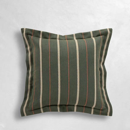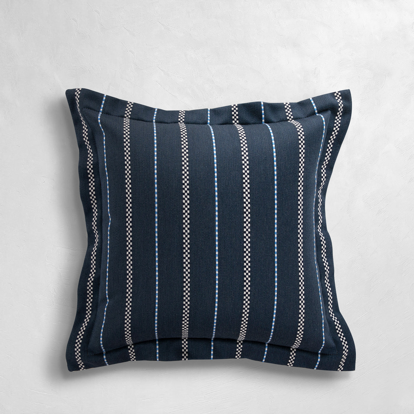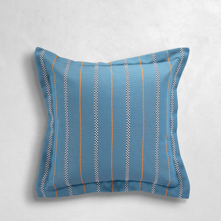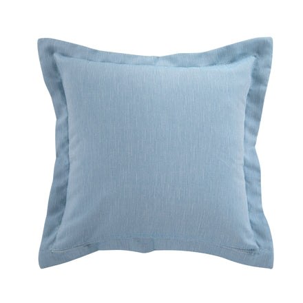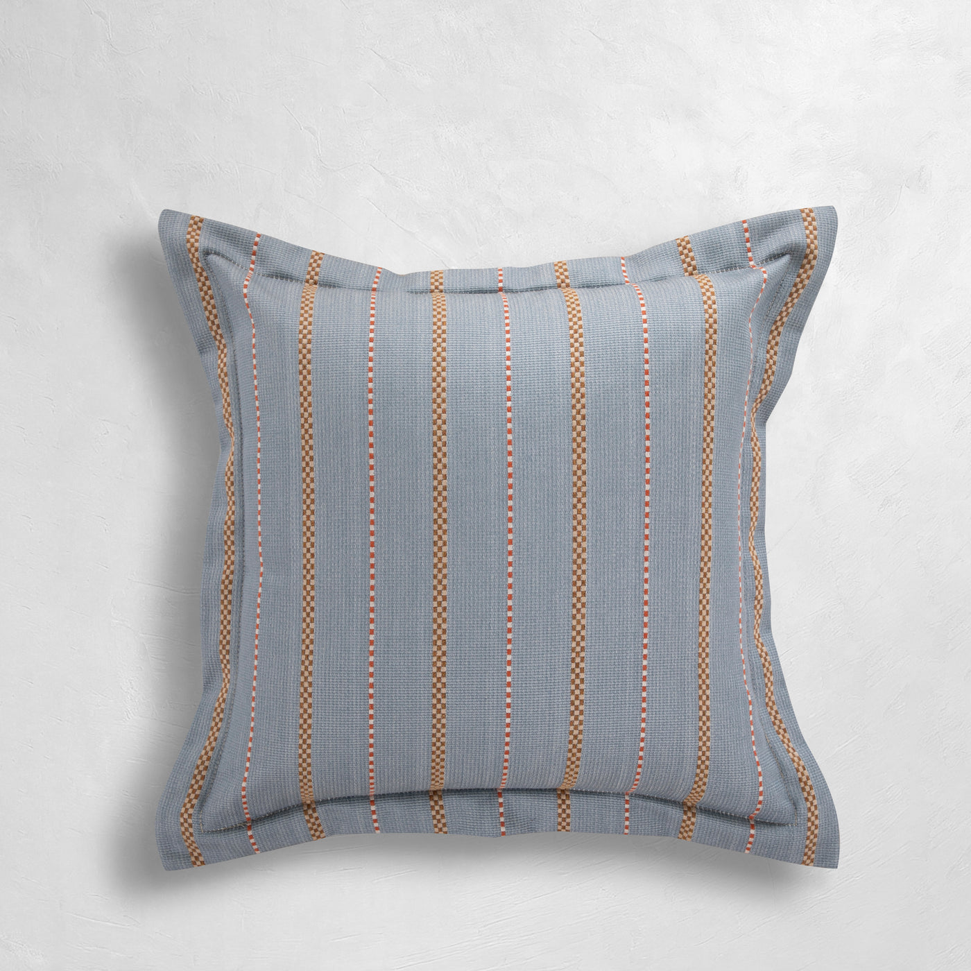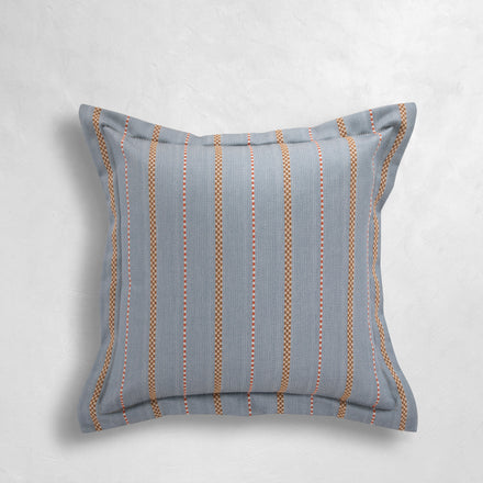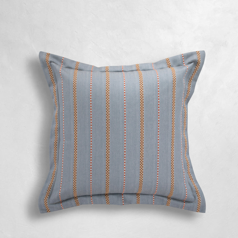 The Foxtrot Chambray pillow blends timeless sophistication with everyday durability, showcasing a chambray blue face highlighted by warm and vivid vertical stripes for visual interest. Finished with a Linen Ruby back and a single flange detail, it balances elegance with versatility. Made in the USA by Summer Classics, this pillow is crafted from easy-care, weather-resistant fabrics that maintain their fresh look season after season, perfect for both indoor and outdoor living.