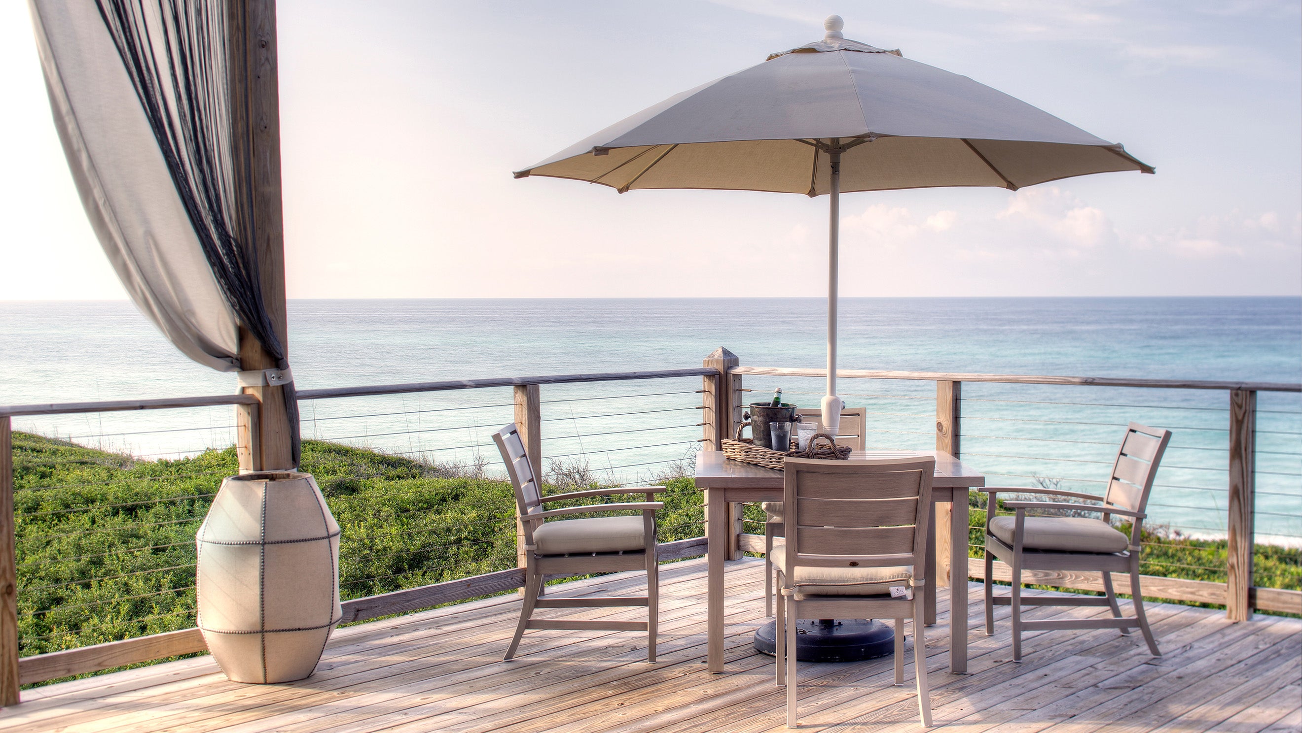 The Seashore Collection combines the look of teak with the durability of resin wood, offering UV protection, water resistance, and low maintenance. Heavier than teak, it’s perfect for windy, coastal climates.