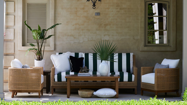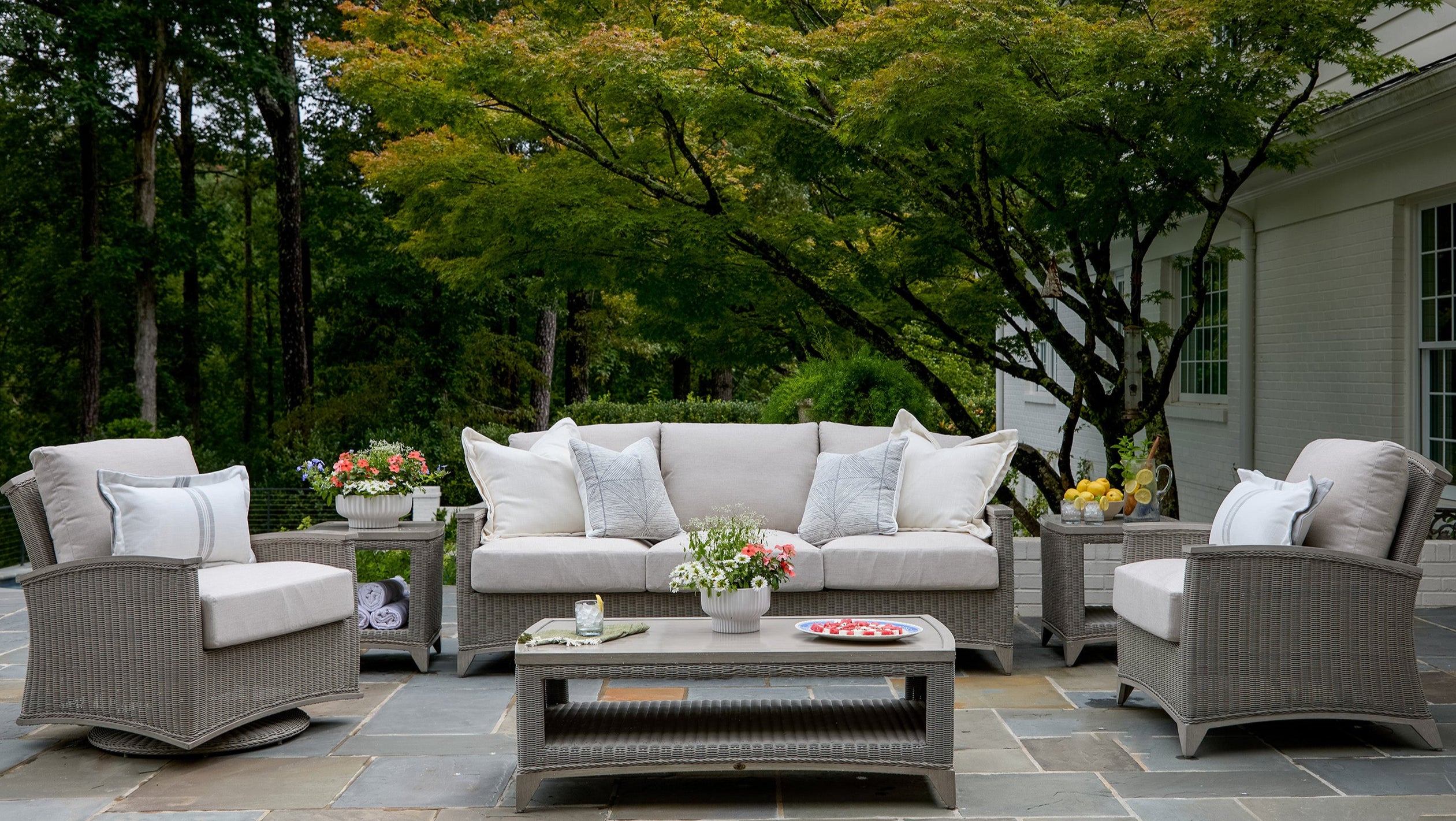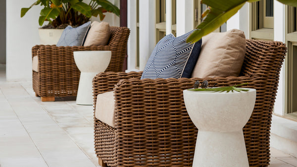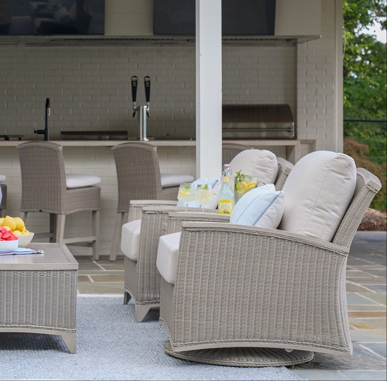 The Newport Collection blends 1950s coastal style with classic wicker craftsmanship, featuring open-weave N-Dura™ resin for a light, airy look and UV-resistant durability, combined with a structured frame and plush cushions for modern comfort.