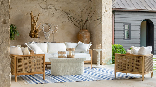 The Montauk Collection features plush cushions and textured large-wicker weave for relaxed comfort. Compact and UV-resistant with natural teak feet, it’s perfect for small patios and offers lasting, low-maintenance charm.