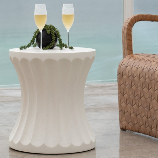 Available in natural white or aged stone grey, each table adds a modern, versatile touch to any indoor or outdoor space.