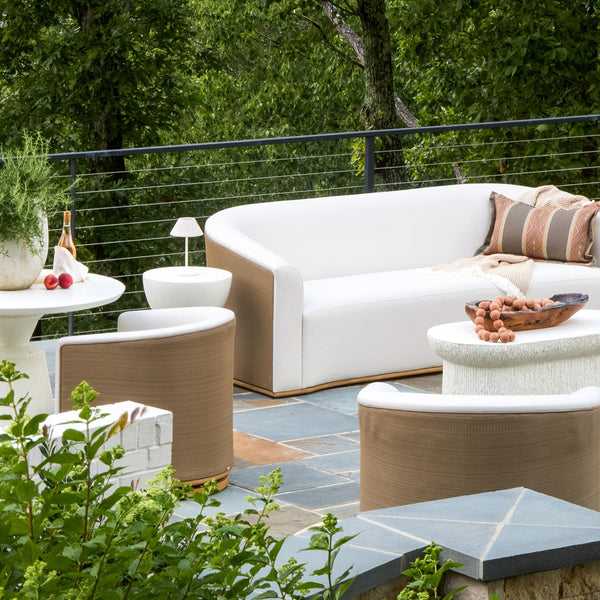 The Peninsula Collection combines coastal charm with year-round durability, featuring an airy open weave and ultra-realistic Raffia resin wicker. Rolled, high-back cushions enhance comfort in this timeless, modern design.