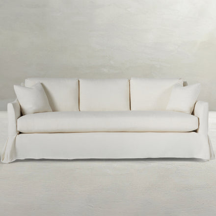 The Baldwin Slipcovered Sofa offers a modern take on European elegance, featuring soft curves, precise tailoring, and sloped arms that nod to classic design. Its down-filled cushions and unique, subtly curved seat enhance comfort and silhouette sophistication. The slipcover adds versatility and ease of care. Available with elongated back cushions and a single bench cushion, it seamlessly blends timeless beauty with contemporary convenience, enriching any decor.