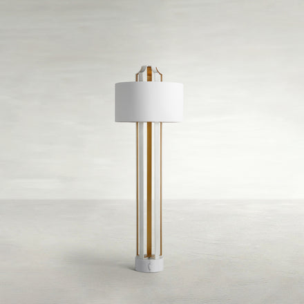 The Krista Floor Lamp is a commanding design piece that draws attention in any room with its 80" height. Its classic styling is beautifully enhanced by a contrasting two-tone finish of coral white and vintage gold, giving it a unique and sophisticated appeal. A solid circle of white marble provides a sturdy base, ensuring stability. The white linen shade diffuses light softly, creating a warm and inviting ambiance. Perfect for living rooms or large spaces, this floor lamp is both functional and stylish.