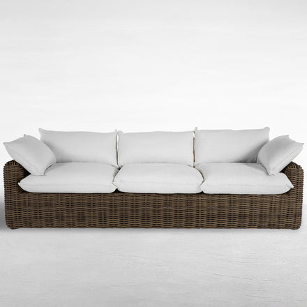 QS Montecito Resin Wicker Sofa, Raffia with Linen Snow Cushions