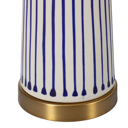 The Sophie Table Lamp showcases the chic detail of the blue hand-painted porcelain body that adds a modern twist to traditional techniques on an antique brass base. The simple pattern is created by vertical columns of thin blue lines ending in an organic paint drip effect, making each lamp elevated and one-of-a-kind. Perfect for living rooms, bedrooms, or offices, the Sophie Table Lamp enhances your decor with its sophisticated design and artistic craftsmanship.