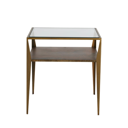 The Winona Side Table is a masterclass in refined elegance and contemporary design. Its slender, tapered legs, finished in a warm, antique brass, provide a sturdy yet graceful foundation that pairs well with a variety of differnt decor styles. The clear glass top offers a pristine surface while the lower shelf, crafted from iron and finished in an oxidized and colorful copper-like magma finish, adds a touch of rustic charm. Perfect for displaying your favorite decorative items or keeping essentials close at hand, the Winona Side Table is a versatile addition to any living space.